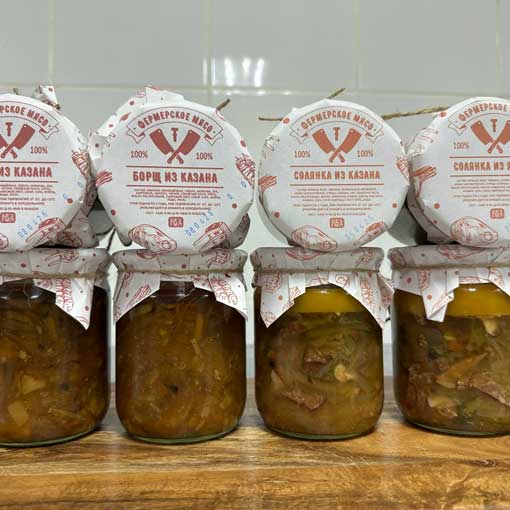 4 банки солянки и 4 банки борща из нашего фермерского мяса.