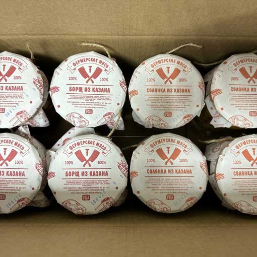 В коробке 8 банок солянки и борща, приготовленных на казане из нашего фермерского мяса.